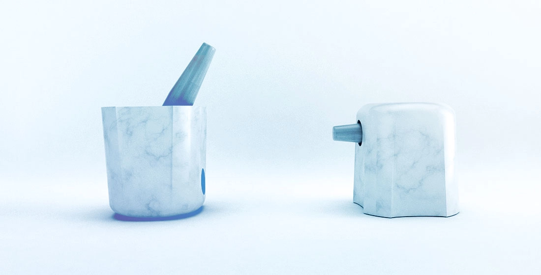 Nel progetto sono stati smussati alcuni tratti caratteristici del mortaio, tuttavia chi ha familiarità con l’oggetto noterà rimandi all’archetipo. La zona concava è rimasta in posizione centrale sostituendo all’abituale cordolo circolare un profilo modellato. Le impugnature sono state inglobate nel corpo lasciando quattro semicerchi nervati alle estremità per mantenere una buona prensione senza vincolare la posizione delle mani. La base ha una superficie d’appoggio ridotta per agevolare la rotazione del corpo e, inoltre, un foro passante offre la possibilità di riporre il pestello durante l’inattività.