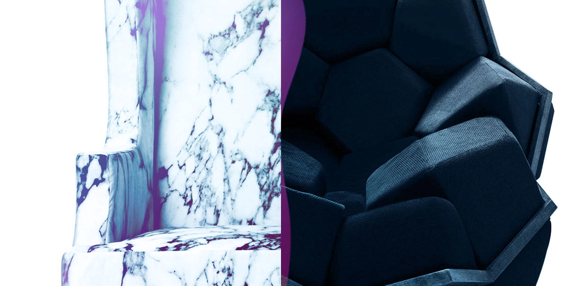 Un esempio simile ma maggiormente destabilizzante è dato dalla seduta di Maurizio Galante. La poltrona in stile Luigi XV appare sfarzosa ed accogliente ma la texture in marmo di Carrara confonde l’osservatore che fatica a inquadrare una simile scelta materica. Avvicinandoci ed osservando con maggiore attenzione ci rendiamo però conto che il materiale di cui è composta è in realtà tessuto stampato spiazzandoci ancora una volta.